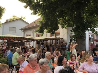 Bei strahlendem Sonnenschein kamen die Gäste ab 18:30 Uhr in den liebevoll geschmückten Hof des Cafe Bizarr um sich einzustimmen und zu stärken. Dafür stand leckeres Fingerfood bereit und bei der großen Auswahl an kühlen Getränken fiel die Wahl zwischen den Weinen des Weinguts Manz, den diversen Cocktails, Bieren und Softdrink schwer. Der Hof war schon lange vor Beginn der Veranstaltung voll besetzt. Um 19:30 Uhr begrüßte die 2. Vorsitzende Susanne Schrimpf die Gäste und moderierte, mit ihrer charmanten Art, unterhaltsam den Abend.