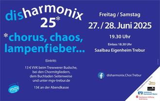 Es wäre naheliegend, ein klassisches „Best-of“-Jubiläumskonzert zu geben, aber das wäre so gar nicht „disharmonix“. Bereits im Sommer letzten Jahres wurden deshalb die Köpfe zusammengesteckt und überlegt, wie ein solches Jubiläumskonzert aussehen könnte. Dann war die Idee geboren: Seit 25 Jahren kennen die Besucher „disharmonix“ auf der Bühne, aber niemand weiß, wie es „hinter den Kulissen“ zugeht. Deshalb hat der Chor einen etwas exzentrischen „Regisseur“ engagiert. Dieser hält das Chaos und Lampenfieber des Chores während eines Konzerts fest, lässt die Konzertbesucher daran teilhaben und führt so unterhaltsam durch den Abend. Es werden ganz besondere Konzerte voller mitreißender Musik, viel Spaß und „disharmonix-Momenten“. Der Chor freut sich sehr darauf, sein 25-jähriges Jubiläum gemeinsam mit den Besucherinnen und Besuchern der beiden Konzerte zu feiern.
