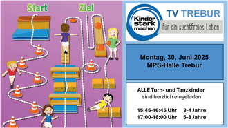 Trebur. Am Montag, den 30. Juni, veranstaltet die Turnabteilung gemeinsam mit dem Kinderturnen und Kindertanzen des TV Trebur einen Aktionstag unter dem Motto „Kinder stark machen“. Um 15:45 Uhr sind die Turn- und Tanzkinder zwischen 3 und 4 Jahren herzlich dazu eingeladen, teilzunehmen. Um 17:00 Uhr startet dann die Runde der 5–8-jährigen Turn- und Tanzkinder. Bei unserem Aktionstag wird es 7 Mitmachstationen geben, an denen die Kinder sich Stempel für jede absolvierte Station abholen können. An Mitmachstationen wie dem Vertrauensparcours, dem Hindernislauf oder auch dem Korbwurf dreht sich alles um Mut, Anerkennung und Teamgeist. Viele Herausforderungen können die Kinder gemeinsam meistern. So erfahren sie, was „stark sein“ alles bedeuten kann.