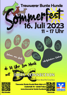 Am Sonntag, 16. Juli findet das große Sommerfest der "Trewwerer Bunte Hunde" auf dem Vereinsgelände, Außerhalb 70 (Fahrradweg nach Groß-Gerau) statt. Wie es aus Tradition üblich ist, wird der Verein seine Gäste wieder mit Gegrilltem und selbstgebackenen Kuchen erfreuen. Um der ganzen Familie das Verweilen auf dem grünen Vereinsgelände noch zu verschönern, spielt erstmals in diesem Jahr die Coverband Dirty Connection mit Livemusik auf. Um 11.00 Uhr beginnt das gemütliche Beisammensein mit Essen und Trinken und ab 14.00 Uhr erklingen bekannte Lieder und sorgen am Nachmittag für gute Laune auf der Wiese. Die Mitglieder und das Vorstandsteam freuen sich auf zahlreiche Gäste bei hoffentlich bestem Wetter.
