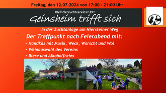 Am Freitag den 12. Juli 2024 öffnet der Kleintierzuchtverein H 391 Geinsheim wieder die Pforte seiner Zuchtanlage im Niersteiner Weg in Geinsheim unter dem Motto „Geinsheim trifft sich“ von 17:00 bis 21:00 Uhr. Ganz zwanglos können sich dort alle treffen und einen Plausch halten. Darüber hinaus gibt für die Gäste diesmal Handkäs mit Musik und Räucherwurst mit Brötchen im Angebot. Der Verein bietet unter anderem ein ausgesuchtes Weinangebot von Winzern aus Mommenheim und Ulversheim.