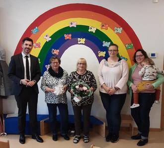 Auch Bürgermeister, Personalrat und Elternbeirat verabschiedeten sich von den beiden Astheimer Erzieherinnen. V. l. n. r.: Jochen Engel, Gabriele Jakob-Schreier, Gabriele Opitz, Michaela Sabottig und Annika Biber mit Elisabeth