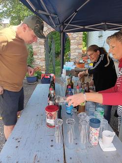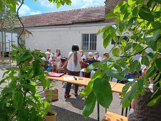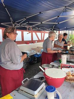 Nach dem Gottesdienst wurde im Pfarrhof in der Kirchgasse 7 allerlei Kulinarisches geboten. Würstchen, gekonnt gegrillt von Christiane mit Hilfe von Ulrike. Irma und Gisela hatten gut zu tun, die köstliche Pilzpfanne und Silke als Waffelbäckerin die hungrigen Mäuler zufrieden zu stellen. Nicole und Christina vom Kirchenvorstand Trebur versorgten die Gäste mit kühlen Getränken.