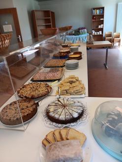 Natürlich gab es noch im Gemeindehaus eine große Kuchentheke mit über 40 Kuchen und Torten aus Trebur und Geinsheim. Bei der großen Hitze mussten aber die Torten im Kühlschrank bleiben. Verena und Heidi hatten alles im Griff und konnten die vielen Gäste zufrieden stellen. Für eine gute Tasse Kaffee dazu sorgte Romy, die Nachschub aus der Küche bekam.