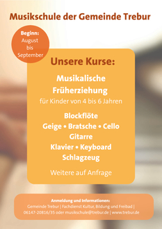 Ob erste musikalische Schritte oder gezielte Förderung – die Musikschule Trebur bietet qualifizierten Unterricht in persönlicher Atmosphäre. Jetzt anmelden und den Grundstein für eine lebenslange Freude an Musik legen!