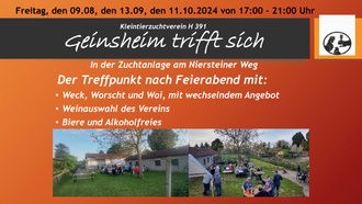 Am Freitag den 09.08.2024 öffnet der Kleintierzuchtverein H 391 Geinsheim wieder die Pforte seiner Zuchtanlage im Niersteiner Weg in Geinsheim unter dem Motto „Geinsheim trifft sich“ von 17:00 Uhr bis 21:00 Uhr. Ganz zwanglos können sich dort alle treffen und einen Plausch halten. Darüber hinaus gibt für die Gäste diesmal Obatzter und Ofenfrischen Leberkäse im Angebot. Der Verein bietet unter anderem ein ausgesuchtes Weinangebot von Winzern aus Rheinhessen.