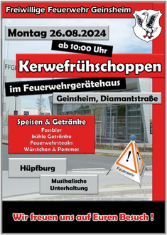 Wir laden die Einwohnerschaft recht herzlich ein zum Kerwefrühschoppen am Kerwemontag, den 26. August 2024 ab 10 Uhr im Feuerwehrhaus in der Diamantstraße. Für musikalische Unterhaltung sowie Speisen und Getränke ist gesorgt. Für die Kinder steht eine Hüpfburg bereit.