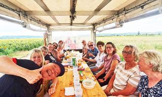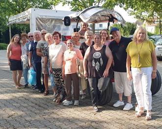 Nicht ganz, denn am Nachmittag des 26. Juli war uns der Himmel gnädig. Und so stand Heinrich Kindinger aus Trebur mit seinem Gespann aus Traktor und Planwagen pünktlich an der Sporthalle Geinsheim, um seine Passagiere im hellen Sonnenschein aufzuladen. Die gut gelaunten Passagiere, das waren keine geringeren als die Mitglieder des Chors „Chorios“ vom Gesangverein Frohsinn Geinsheim.