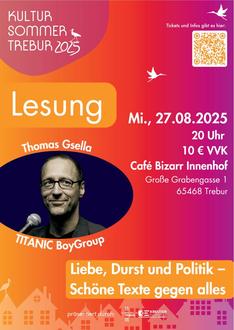 Am Mittwoch, den 27. August 2025, ist der vielfach ausgezeichnete Satiriker, Lyriker und frühere Titanic-Chefredakteur Thomas Gsella zu Gast im Hof des Café Bizarr in Trebur (Große Grabengasse 1). Dort präsentiert er sein aktuelles Programm „Liebe, Durst und Politik – Schöne Texte gegen alles“ – ein pointierter Streifzug durch das Absurde und Allzumenschliche.