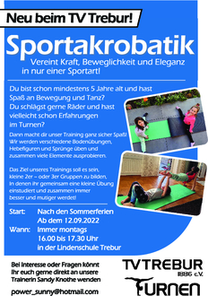 Wir erweitern unser Angebot für Kinder um Akrobatiktraining und freuen uns auf viele interessierte Kids mit Spass an Turnen und Tanz. Anmelden könnt ihr Euch unter turnen@tv1886-trebur.de. Unsere Trainerin Sandy Knothe beantwortet gerne alle aufkommenden Fragen (power_sunny@hotmail.com)