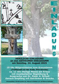 Alle sind herzlich eingeladen am Sonntag, dem 24.08.2025, um 11:00 Uhr zu Gottesdienst und Feier am Kreuzdamm. Die Eucharistiefeier wird Herr Pfarrer Loch feiern, die festliche Ansprache übernimmt Dr. Peter A. Schult. Im Anschluss findet eine Begegnung mit Getränken und Snacks durch den Förderverein St. Petrus in Ketten Astheim e. V. statt. Für ausreichend Sitzgelegenheiten ist gesorgt.