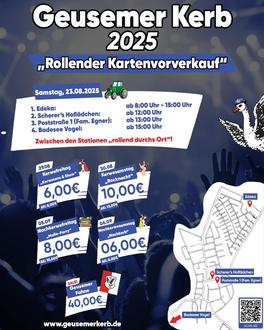Am Samstag, den 23. August 2025, findet der „Rollende Kartenvorverkauf“ für die Geusemer Kerb statt. Die Geusemer Alt-Kerwevädder verkaufen an diesem Tag Eintrittskarten für alle Kerweabende zum vergünstigten Vorverkaufspreis. Los geht es bereits ab 8:00 Uhr am Edeka in Geinsheim, wo bis 15:00 Uhr eine feste Verkaufsstation eingerichtet ist. Darüber hinaus sind die AKVs mit der Jubirolle „rollend durchs Ort“ unterwegs und steuern mehrere Stationen im Laufe des Tages an. Ab 12:00 Uhr sind sie bei Scherer’s Hoflädchen, ab 13:00 Uhr an der Poststraße 1 bei Familie Egner und ab 15:00 Uhr am Badesee Vogel anzutreffen. Dort können Besucher Tickets für Kerwefreitag, Rocknacht, Malle-Party und weitere Veranstaltungen erwerben – jeweils zum günstigeren Vorverkaufspreis. Auch die Geusemer Fahne wird an diesem Tag zum Verkauf angeboten. Zudem können weiterhin Karten im Vorverkauf bei Scherer’s Hoflädchen erworben werden – und zwar bis einschließlich Kerwefreitag.