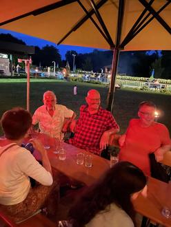 Am Samstag (19. August) fand unser Gegenbesuch im Freibad Gimbsheim statt. Anlässlich der letzten Vorstandssitzung hatte uns David Profit, 1. Vorsitzender des Betreibervereins, Freibad Gimbsheim besucht und unser schönes Freibad erkundet. Wir verbanden unseren Besuch mit der Veranstaltung „Vollmondschwimmen“. Der Schwimmverein Gimbsheim veranstaltet dieses Event jeden Monat während der Saison. Das wollten wir auch ausnutzen und machten uns auf den Weg. Die Schwimmbadfreunde (Emmy, Doris, Gerd, Erhard, Markus & Hülya) setzten am frühen Abend mit der Fähre über und genossen den traumhaften Sommerabend im Gimbsheimer Freibad. Wir wurden von David Profit, dem Vorsitzenden des Vereins, und Gabi Keller, der Betriebsleiterin des Freibades, herzlich empfangen. Bei einem Rundgang erkundeten wir das sehr gepflegte Freibad, das 1974 erbaut wurde. Auch hier gibt es zwei Becken, ein 50m-Becken für Schwimmer und ein Nichtschwimmerbecken. Außerdem gibt es ein Kleinkinderbecken mit einem automatisch ausfahrenden Sonnensegel. Für das Event sind durch 2 Scheinwerfer am Beckenrand die Becken bis auf den Grund gut ausgeleuchtet, so dass die Badeaufsicht eine gute Sicht hat und die Sicherheit gewährleistet ist. Fackeln, Feuerkörbe und Lichterketten sorgten für Stimmung. Eine Band spielte und rundete die Atmosphäre ab. Wir erfrischten uns am Cocktailstand, versorgten uns am Kiosk mit herzhaften Leckereien und genossen den Abend. Kurz vor 23.00 Uhr machten wir uns wieder auf den Weg nach Trebur, an diesem Abend war wegen dem Kellerwegfestes die Fähre noch in Betrieb und wir konnten bei toller Nachtstimmung wieder übersetzen. Es war ein toller Abend, herzlichen Dank an David Profit und sein Team. Herzliche Grüße Euer Vorstand
