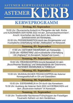 Von Kerwefreitag, dem 2. September bis einschließlich Kerwedienstag, dem 6. September heißt Sie die Astemer Kerwegesellschaft 1988 und der Schaustellerbetrieb Biebel (mit Essens- und Süßigkeitenständen sowie Fahrgeschäften) auf dem Astemer Kerweplatz wieder herzlich Willkommen!