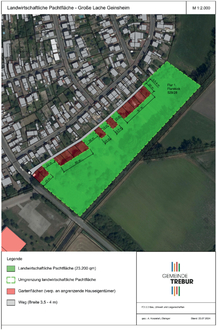 Verpachtet wird die rückwärtige Fläche bis zum Graben sowie leerstehende oder zurückgegebene Pachtflächen (im Bereich der Verlängerung zu den Grundstücken Lachenweg 1 bis Lachenweg 33) im vorderen Bereich (20 Meter). Es ist vorgesehen bei Rückgabe der Pachtgärten diese nach und nach an die landwirtschaftliche Pachtfläche anzugliedern. Lageplan hängt der Ausschreibung an.