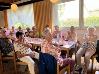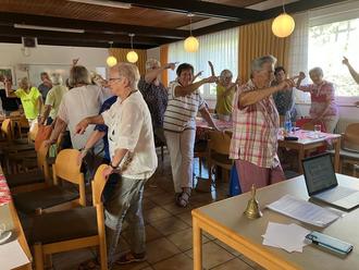 Demzufolge hieß es bei der nächsten Übung: Aufstehen, mit der rechten Hand eine „sechs“ in die Luft malen und gleichzeitig mit dem linken Fuß einen „Kreis“ formen. Was unter viel Gelächter auch nur schwerlich zustande gebracht wurde.