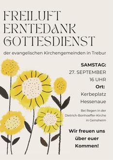 | 16:00 Uhr | Freiluft-Gottesdienst zum Erntedankfest auf dem Hessenauer Kerweplatz, bei Regen in der Dietrich-Bonhoeffer-Kirche in Geinsheim |
