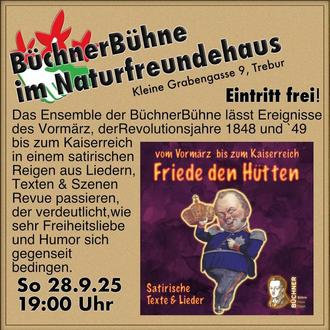 Das Ensemble der Büchner Bühne lässt Ereignisse des Vormärz, der Revolutionsjahre 1848 und '49 bis zum Kaiserreich in einem satirischen Reigen aus Liedern, Texten & Szenen Revue passieren, der verdeutlicht, wie sehr Freiheitsliebe und Humor sich gegenseitig bedingen.