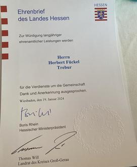 Für sein ehrenamtliches Engagement wurde Herbert Fückel am 19. Januar mit dem Ehrenbrief des Landes Hessen ausgezeichnet. Er ist damit einer von nur rund 1.000 Hessen, die in diesem Jahr diese Auszeichnung erhalten. Die feierliche Übergabe der Urkunde durch Landrat Will fand im Landratsamt statt und wurde Herbert Fückel im Beisein seiner Frau Birgit, seiner drei Töchter, Bürgermeister Engel und MGV-Vorstandsmitglied Susanne Schrimpf überreicht.