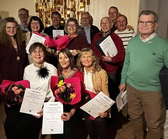 Für 25 Jahre aktives Singen wurden ausgezeichnet: Silvia Jourdan-Nickel, die sich als Mitglied des erweiterten Vorstands um das Bühnenbild und die Kulinarik kümmert, Klaus Roos, der langjährigste Solist der „disharmonix“, Petra Roth, die erste Notenwartin der „disharmonix“, sowie Susanne Schrimpf, die langjährige Chorsprecherin der „disharmonix“ und seit 2022 Mitglied des geschäftsführenden Vorstands.