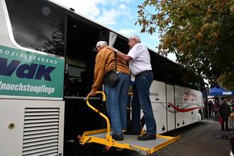 Die Regentropfen, die von Zeit zu Zeit auf Trebur herunterfielen, trübte die Freude der Aktiven des VdK Ortsverbandes Astheim-Trebur bei dem beliebten Straßenfest nicht, das dank der unermüdlichen Organisatoren endlich wieder stattfinden konnte. Der große Reisebus war nicht nur Blickfänger, sondern fand das Interesse vieler Besucherinnen und Besucher. Mit einem solchen Bus ist ein barrierefreies Reisen möglich, mittels einer Plattform können Mobilitätseingeschränkte in den Bus hochfahren, ein Rollstuhl kann sicher festgemacht werden und eine barrierefreie Toilette macht das Reisen stressfrei.