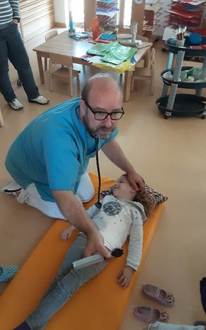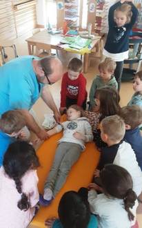Um den Kindern die Angst vor einem Krankenhausaufenthalt zu nehmen, erklärte Mario an einer freiwilligen Patientin die Vorgehensweise, wenn ein Kind mit Schmerzen in die Klink kommt. Paula, unsere Patientin, hat keine Angst vor Ärzten und war deswegen prädestiniert diese Rolle zu übernehmen. Mario führte mit Paula Gespräche, untersuchte die Augen, Ohren, den Bauch, hörte das Herz ab und zeigte spielerisch wie Blut abgenommen wird. Zudem erklärte er den Kindern wie es weitergeht, wenn ein Kind zum Beispiel stationär aufgenommen werden muss. Die Kinder wurden bei allem miteinbezogen, durften Fragen stellen und sogar in die Ohren von Paula hineinschauen.
