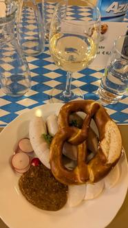 Nach einem passenden Gedicht über die „Weißwurst“ von Astrid & Lieselotte konnten die Gäste die bayrischen Spezialitäten in Form von schmackhafter Weißwurst oder herzhaftem Obatzten mit frischen Laugenbrezeln und Radi genießen.