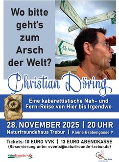 Ein besonderes kabarettistisches Highlight ist am 28. November in Trebur zu erleben. Christian Döring, Regional-Beauftragter für Feierabend-Kabarett kommt ins Naturfreundehaus in der Sandkaute. Ab 20 Uhr begibt er sich mit seinem neuen Programm „Wo bitte geht’s zum Arsch der Welt?“ auf eine kabarettistische Nah- und Fern-Reise von Hier bis Irgendwo.