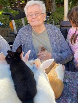 Ein besonderer Höhepunkt waren die Kaninchenbabys. Mit mehreren Körbchen, in denen jeweils ein Kaninchenbaby mit Möhre saß, ging es von Zimmer zu Zimmer, so dass wirklich jeder Bewohner die Gelegenheit hatte, die kleinen Tiere hautnah zu erleben.
