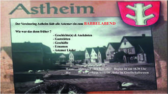In einer hoffentlich großen Runde möchten wir gerne mit Euch über die Ortsgeschichte Astheims babbele. Sicher kann uns der ein oder andere erzählen wie das früher so war.