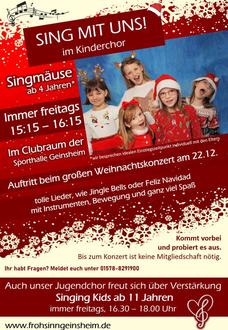 der Kinderchor des Gesangvereins Frohsinn Geinsheim öffnet für alle Kinder seine Türen, die beim großen Weihnachtskonzert am 22.12. mitmachen wollen. Tolle Weihnachtslieder lernen, viel Spaß haben und am Weihnachtskonzert allen Frohsinn-Chören die Show stehlen, darum geht es ab heute in Geinsheim. Alle Kinder ab 4 Jahren können mitmachen.