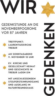 Am Sonntag, den 9. November um 18:00 Uhr, laden die Evangelische Kirchengemeinde Trebur und der Verein Gesellschaft Heimat und Geschichte in Trebur zur Gedenkstunde an die Novemberpogrome in die Laurentiuskirche Trebur ein.
