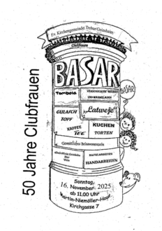 Am Sonntag, dem 16. November 2025 gibt es im Evangelischen Gemeindehaus in der Kirchgasse 7 wieder allerlei Selbstgemachtes zu erstehen und auch für das leibliche Wohl ist mit Kaffee, Kuchen aus eigener Herstellung und auch Deftigem bestens gesorgt.