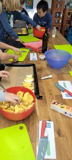 Dies galt auch für den im Anschluss stattfindenden Kochkurs: Katrin Göttke vom Landfrauenverein hat mit viel Empathie und Herzblut die Kinder in die Welt des Kochens eingeführt. An 3 Tagen hatten jeweils 10 Kinder die Möglichkeit in diesen Genuss zu kommen. Mit viel Freude und Interesse lernten sie die Zutaten und ihre Zubereitung kennen. Jedes Kind hatte als Koch seine Aufgaben. Auch das Tischdecken und die Tischkultur waren ein Bestandteil des Kochkurses. Alle Kinder haben mit Genuss gegessen. Wir möchten uns bei Katrin Göttke und dem Landfrauenverein herzlichst bedanken, den Kindern diese Möglichkeit gegeben zu haben.