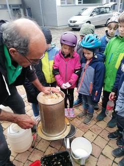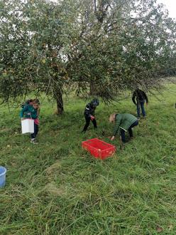 Am ersten Tag lief die Gruppe gemeinsam zu den Treburer Streuobstwiesen des NABU. Dort wartete Ferdi Mendel vom NABU, der den Kindern vieles über die Streuobstwiesen zu berichten hatte. Eifrig pflückten und schüttelten die Kinder die reifen Äpfel von den Bäumen. Auch lernten die Kinder, dass die bereits herabgefallenen Äpfel besonders gut für den Apfelsaft geeignet sind. Nachdem eine beachtliche Menge Äpfel gelesen wurde, ging es wieder zurück zur Lindenschule. Am nächsten Tag zeigte Ferdi Mendel den Kindern, wie aus den Äpfeln köstlicher Apfelsaft gemacht wird. Begeistert halfen die Kinder die ungespritzten, vorgewaschenen Äpfel in den Apfelhäcksler zu geben. In der Obstpresse entstand köstlichster Bio-Apfelsaft, der den Kindern äußerst gut schmeckte. An dieser Stelle möchten wir Ferdi Mendel vom NABU für seinen Einsatz herzlichst danken. Besonders hervorzuheben ist, dass die Kinder bei jedem Schritt tatkräftig mithelfen durften.