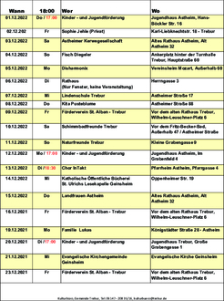 Sich gesellig treffen, gemeinsam Weihnachtslieder singen, einen Punsch oder Glühwein trinken und Plätzchen knabbern! Gerne laden wir dazu diesen Dezember wieder ein. Nach zweijähriger Pause findet der Lebendige Adventskalender in diesem Jahr vom 01. - 23.12. wieder statt. Die einzelnen Termine finden Sie in der folgenden Übersicht.