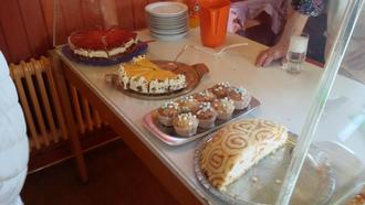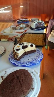 Auch selbstgestrickte Socken und Bastelarbeiten wurden gerne gekauft. Im oberen Stock des Gemeindehauses konnte man gemütlich zusammensitzen. Bei Kaffee und Schwarzwälder Kirsch Torte bis Muffins, Eierlikör-, und Buttermilchkuchen, Friesentorte, Bienenstich, Apfel- und Streuselkuchen, sowie Windbeutel und vieles mehr waren viele zusammengekommen um wieder einmal Erinnerungen und auch Neuigkeiten auszutauschen.