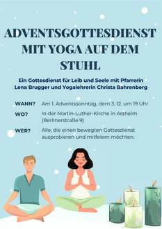 | 19:00 Uhr | Yogagottesdienst mit Pfrin. Lena Brugger und Christa Bahrenberg |