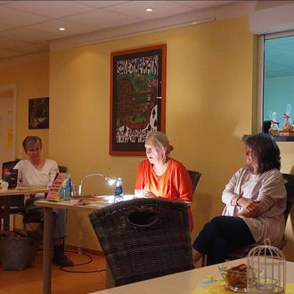 Britta Röder stellte drei Bücher vor: „Lügen über meine Mutter“ von Daniela Dröscher, „Fremder Champagner“ von Martina Berscheid und „Blauschmuck“ von Katharina Winkler. Aus ihrem neuen Erzählband „Fliehkraft“ las sie ebenfalls eine Geschichte. Im Anschluss daran trug Anette Welp zwei Erzählungen aus ihren Büchern „Funkensausen“ und „Die Welt meistern“ vor.