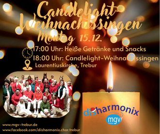 „disharmonix, der moderne Chor des MGV Mozart Trebur, lädt im Rahmen des „Lebendigen Adventskalenders“ der Gemeinde Trebur zum „Candlelight-Weihnachtssingen“ ein.