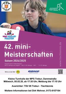 Auch wer bislang noch nie in seinem jungen Leben einen Schläger in der Hand hatte, aber gerne einmal erste Erfahrungen mit dem schnellsten Ballsport der Welt sammeln möchte, ist herzlich zum Mitmachen eingeladen, Schläger werden bei Bedarf gestellt. Und mitmachen lohnt sich: Die besten „minis“ können sich für die Kreis- und Bezirksentscheide sowie für die Endrunden der Landesverbände oder sogar für das Bundesfinale im Juni 2025 qualifizieren. Die mini-Meisterschaften, die erstmals 1983 ausgetragen wurden, sind mit mehr als 1,4 Millionen Teilnehmenden eine der erfolgreichsten Breitensportaktionen im deutschen Sport überhaupt. Prominentester „mini“ ist Bastian Steger, der mit der deutschen Nationalmannschaft mehrfach Medaillen bei Olympischen Spielen, Welt- und Europameisterschaften gewann. Sponsoren der Nachwuchsaktion des DTTB sind die Tischtennisfirma DONIC und der Versicherungskonzern ARAG.