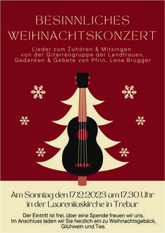 | 18:00 Uhr | Besinnliches Weihnachtskonzert mit Gebeten und Gedanken, Laurentiuskirche, mit der Gitarrengruppe der Landfrauen und Pfarrerin Lena Brugger. Im Anschluss Einladung zu Weihnachtsgebäck, Glühwein und Tee |