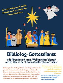 | 10:00 Uhr | Gottesdienst mit weihnachtlichen Gedichten und Geschichten, Lektorin Renate Leppla und Team |