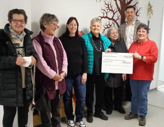 Heike Stängle, Vorsitzende der AWO Geinsheim, übergibt gemeinsam mit weiteren Mitgliedern der AWO einen Scheck in Höhe von 1.500€ für den neuen Kletterturm auf dem Außengelände der Kita.