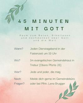 | 19:00 Uhr | „45 min mit Gott“ im Gemeindehaus |