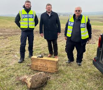 Bürgermeister Joachim Kandels(Bildmitte) mit zwei Mitarbeitern des Kampfmittelräumdienstes nach der erfolgreichen Entschärfung