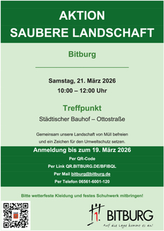 Wie in den vergangenen Jahren, so führt die Stadt Bitburg auch in 2026 eine Aktion Saubere Landschaft durch. Die freiwilligen Helferinnen und Helfer werden dabei in der Innenstadt Straßen- und Bahnböschungen sowie weitere Flächen von allerlei Unrat säubern, den achtlose Zeitgenossen hinterlassen haben.
