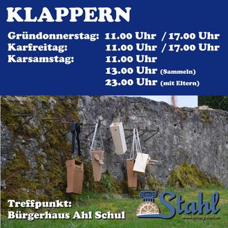 In der Woche vor Ostern wird wieder der alte Brauch des Klapperns in Stahl von den Jungen und Mädchen des Dorfes wahrgenommen. Alle Kinder, die sich beteiligen wollen, treffen sich am Gründonnerstag (02.04.) Karfreitag (03.04.) und Karsamstag (04.04.) am Bürgerhaus Ahl Schul. Dort erfolgt die Aufteilung in Gruppen, die dann mit ihren Holzklappern in den einzelnen Straßen klappern und folgenden Spruch dabei aufsagen: