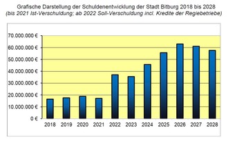 Der Schuldenstand der Stadt Bitburg beläuft sich zum 31.12.2022 auf insgesamt 19,8 Millionen Euro. Davon entfallen 14,9 Millionen Euro auf die Stadt Bitburg und 4,9 Millionen Euro auf die Regiebetriebe der Stadt Bitburg wie Eissporthalle (0,7 Millionen Euro), Cascade Freizeitbad (2,3 Millionen Euro) und Stadthalle (1,9 Millionen Euro). Zum Ende des Haushaltsjahres 2023 erhöht sich der Schuldenstand auf 35,7 Millionen Euro. Gegen Ende des Finanzplanungszeitraumes 2026 wird die Verschuldung auf rd. 63,0 Millionen Euro ansteigen.