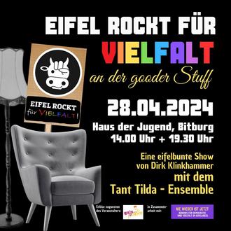 Mit dem bekannten Tant Tilda Ensemble und vielen regionalen Überraschungsgästen präsentiert Dirk Klinkhammer gemeinsam mit dem Bündnis für Demokratie und Vielfalt im Eifelkreis eine eifelbunte Demo für Vielfalt auf der Bühne des Bitburger Haus der Jugend. Am 28. April wird es zwei Vorstellungen als Stehkonzert geben – um 14 und um 19:30 Uhr. Für Menschen mit Schwierigkeiten beim längeren Stehen gibt es einige Sitzplätze auf der Empore. Der Erlös ist für Demokratie-Arbeit des Hauses der Jugend bestimmt.